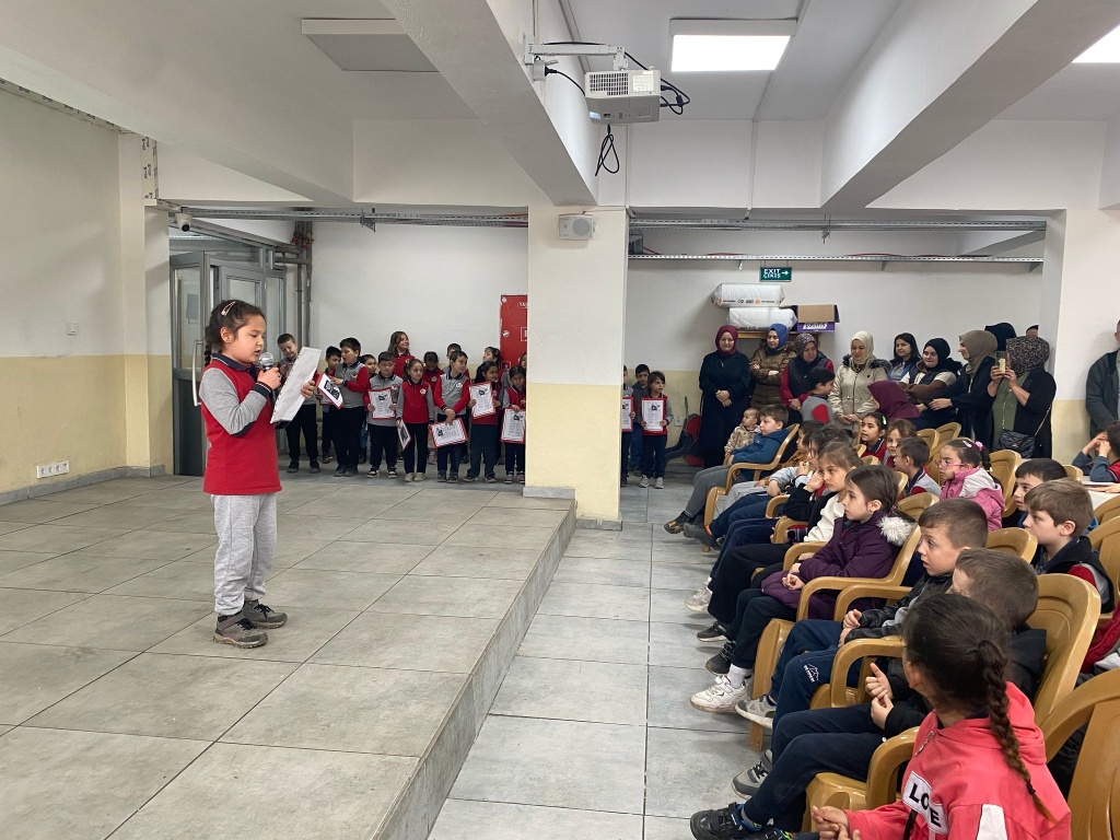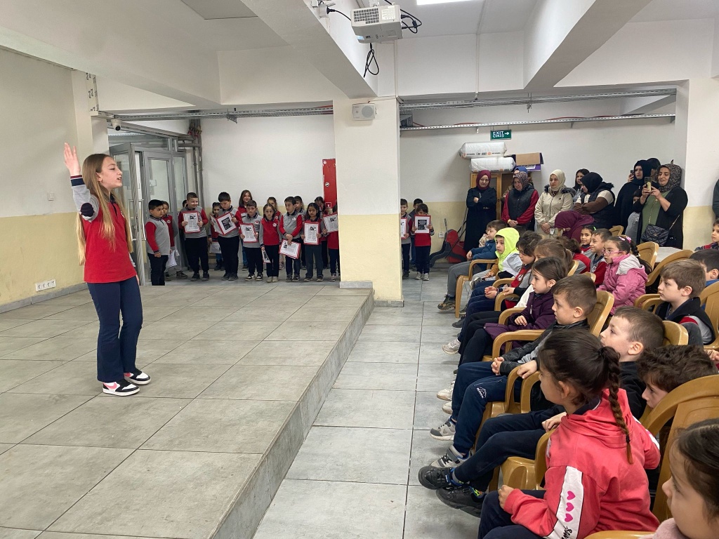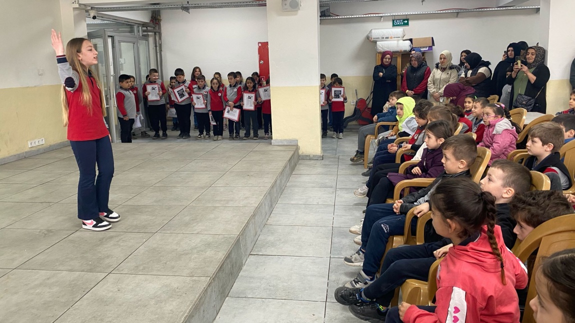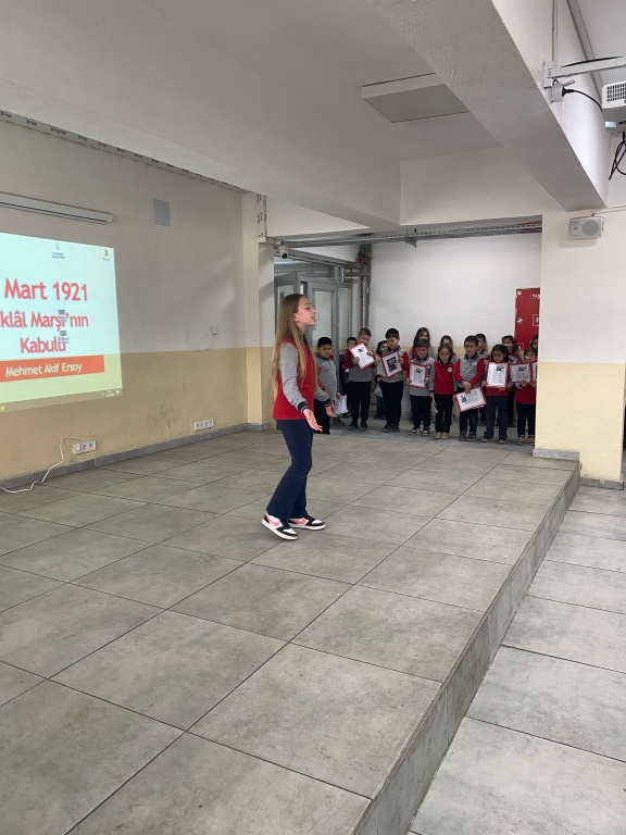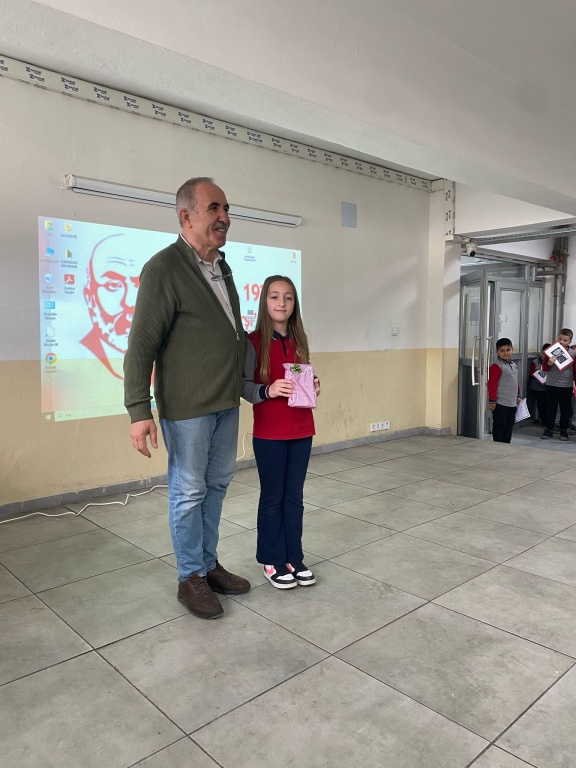 İstiklal Marşı okumalarında sınıflar arası yapılan yarışmalarda öğrencimiz Eylül ÇEVİK birinci seçilerek hediyesini Okul Müdürümüz Sayın Rahmi SEZGİN'in elinden almıştır.