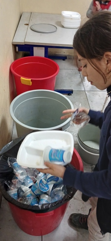 Ekip üyeleri, yemek sonrası arta kalan yiyecekleri titizlikle ayrıştırarak kompost yapımında kullanıyor. Böylece hem gıda israfı önleniyor hem de organik atıklar yeniden değerlendirilerek toprağa kazandırılıyor.